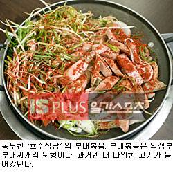 호수식당에선 밥과 함께 점심메뉴로도 낸다. 밥에 얹어 비벼먹어 봤다. 당시엔 이색적이었을지 몰라도 이미 부대찌개에 익숙한 사람들에겐 익숙한 맛이다. 부대볶음의 원형도 이것과 달랐을 것이라는 생각이 들었다. '오뎅식당'의 허기숙 할머니는 "지금의 부대찌개보다 훨씬 다양한 재료가 들어갔다.