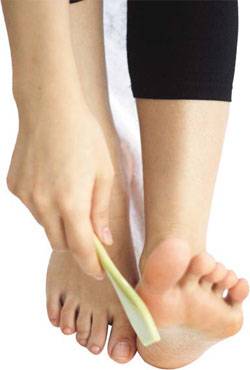 오렌지나 귤 같은 감귤류의 껍질이나 유자차의 유자 찌꺼기를 발에 문질러 주는 것도 좋다. 과일 껍질에는 '알파하이드록시산(Alpha Hydroxy Acid, AHA)'이라는 성분이 들어있어 피부 각질층을 제거해주고 보습효과도 있다.