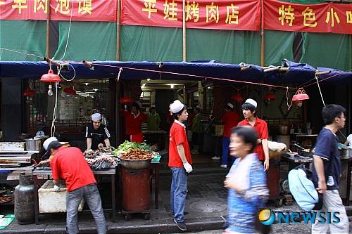 27일(현지시간) 오후 중국 섬서성 시안(西安)시 북루((北樓)의 뒷편에 위치한 회족거리에서 많은 관광객과 회족 상인들의 모습들이 무더운 날씨에도 불구하고 활기가 넘친다.