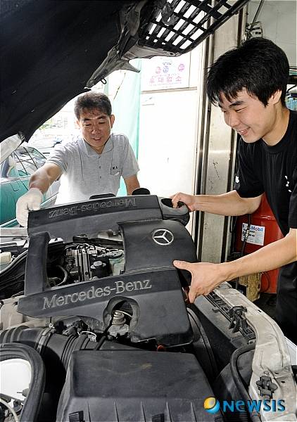 자동차 벤츠 수리 전문업체인 전원사 이관훈 사장(왼쪽)이 1일 오전 서울 성동구 용답동 전원사에서 직원과 차량 수리를 하고 있다. /홍찬선기자 mania@newsis.com