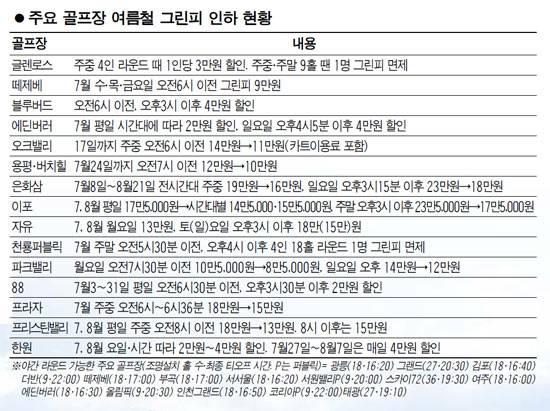 포천아도니스도 7월 평일 오전7시 이전 4만원을 내려 받고 오크밸리는 주중 그린피가 14만원이지만 17일까지 오전6시 이전 시간대에 카트 이용료를 포함, 11만원만 받는 이벤트를 진행하고 있다. 삼성에버랜드가 운영하는 안성베네스트와 퍼블릭 글렌로스는 주말 할인 시간대에 4명 중 1명의 그린피를 면제해준다. 파크밸리ㆍ그랜드ㆍ용평ㆍ한원ㆍ에딘버러ㆍ더반ㆍ강남300ㆍ떼제베ㆍ88ㆍ아리지ㆍ몽베르 등도 시간대별로 그린피를 내려 받고 있다.