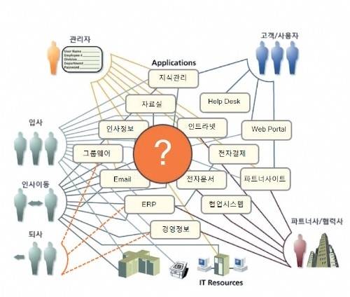 Market 사용자정보(Identity), 인증 및 인가 인프라를 고려하지 않은 전통적인 사용자 관리체계에서 애플리케이션과 시스템도입으로 관리비용이 크게 증가 하고 있다. 업무가 IT로 넘어온 상황에서 소프트웨어, 하드웨어는 물론 각종 문서에까지 보안을 위해 혹은 사용자 제한을 위해 Id, Pw를 사용하게 되고 초기에 이러한 업무방식에 대한 전반적인 기획이 이뤄지지 않은 채 구축된 시스템들로 인해 커다란 문제점을 발생시키고 있다.
