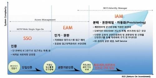 인증단 한 번의 로그온으로 접근 가능 하게함허가된 사용자만 인증함인가·권한차별화된 업무 시스템 접근제어통합된 접근 정책관리로 보안 강화분배·권한위임·자동화계정정보의 분산환경에 적합한 ID관리단편적인 SSO/EAM 기능의 한계, 인프라의 접근 절실다양한 유형의 권한 통합관리 및 권한정의, 신청을 단일창구를 통해 처리하여 추적 및 모니터링ID 관리의 권한위임, Self Service분배ㆍ권한위임ㆍ자동화