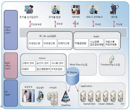 IDMS는 ID발급 신청에서부터 승인에 이르는 ID Lifecycle을 관리하는 시스템이며 Front office layer, back officelayer, interface layer로 구성