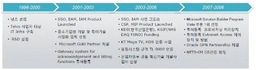 1998년 설립 이후 통신사업자, Portal, 게임 사업자를 대상으로 e-Business 인프라 솔루션 구축 사업을 통하여 통합 인증 솔루션과 서비스 관리 플랫폼 사업을 성공적으로 수행하였으며, 2001년 R & D실을 설립 후 매년 평균 7명 이상의 전문 인력을 배치하여 꾸준히 제품 개발에 투자하여 7건의 특허 획득과 GS인증, TL9000 품질인증을 획득하는 성과를 냈고, 향후 글로벌 기업으로의 도약을 위해 국제특허 출원 및 자체 기술 역량 강화에 총력을 기울이고 있다.