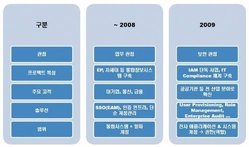 IAM 시장은2007년 3조원에서 2012년 6조원이상으로 약200% 이상 성장이 예상된다. 특히 2012년, SW 라이센스비율이 50% 수준으로 여전히 컨설팅, 구축 등 서비스이슈가 존재하고 IAM을 조직전체를 포괄하는 정보보안 인프라영역으로 분류하고, 인증 및 인가와 관련된 프로세스를 효율적으로 지원하는 독립된 정보기술아키텍처로 인식한다.
