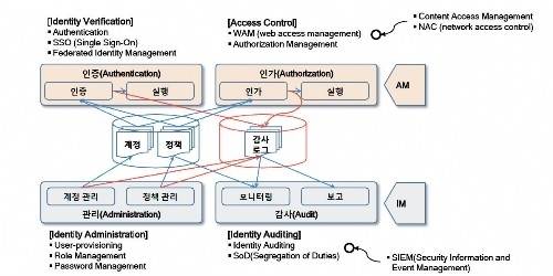 또한 준법감시(regulatory compliance -SOX, PCI, GBLA, HIPAA, JPIPA) 요구로 전 세계의 기업들은 필수적으로 IAM 아키텍처를 구축해야 하는 상황이다. IAM아키텍처를 구축하는 여러 기술요소 중에서 WAM, User Provisioning 솔루션이 75% 수준으로 IAM 시장을 선도하고 있으며 계정 및 접근관리는 GRC(governance, risk, compliance) 실행을 위한 핵심 통합요소로써 지속적인 성장이 전망되고 있다.