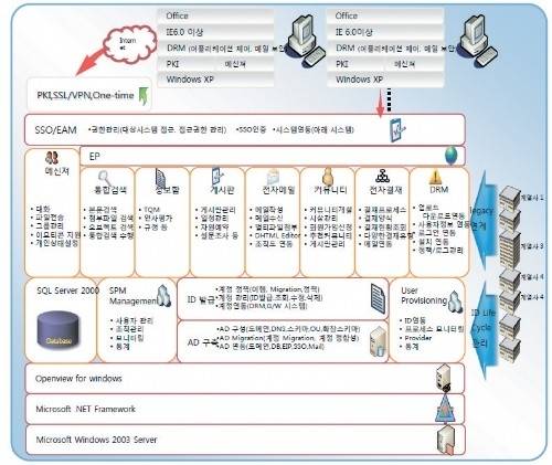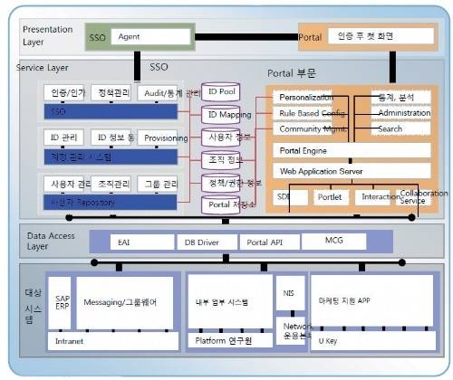 Portal & SSO를 통해 아래와 같은 시스템과 연동하며, 통합 계정 관리 시스템인 SPM을 이용하여 인사정보, 계정정보에 대한 통합 Repository 구성함