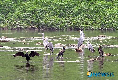 겨울 철새로 알려져 있으며 국내에서의 번식에 대한 자료가 아직 없는 민물가마우지들이 6일 오전 서울 중랑천과 청계천 합류지점에 왜가리들과 섞여 앉아 있다.