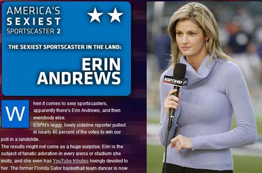 에린 앤드류스는 미국 스포츠케이블채널 ESPN의 인기리포터다. 그는 지난 2000년 플로리다 대학을 졸업한 뒤 2001년 폭스 스포츠 플로리다에서 리포터 생활을 시작했다. 그의 아버지 스티브 역시 에미상을 6번이나 수상한 언론인 출신이다. 2004년 5월 ESPN의 리포터가 된 그는 여성으로서는 보기 드문 해박한 스포츠 지식과 아름다운 외모로 큰 인기를 얻었다.