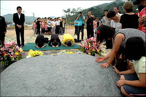 지난 7월 10일 우리는 49재를 지내고 고(故) 노무현 대통령의 유골을 부엉이바위 밑에 안장했습니다. 그리고 고인의 뜻에 따라 작은 비석을 세웠습니다.