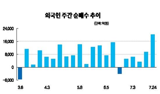 외국인의 주식 매수세는 국내 기업들의 2ㆍ4분기 실적발표를 계기로 무서울 정도로 확대되는 추세다. 최근 코스피지수가 10거래일 연속 상승하는 동안 9거래일 연속 외국인의 '사자' 공세가 이어졌다. 일별 순매수 금액도 하루를 제외하고는 모두 3,000억원 이상에 달했다. 외국인들은 이 같은 대규모 주식 매입을 통해 주가 상승을 이끄는 유일한 수급 주체로 자리매김했다. 반면 기관투자가들은 교체매매, 개인은 매도에 치중하고 있다.