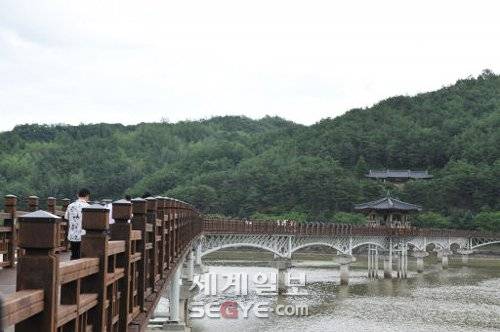 ◇안동댐을 가로지르는 월영교는 우리 땅에서 가장 긴 목책 인도교이다. 387m에 이를 정도로 긴 다리여서인지 다리 중간에 정자를 하나 품고 있다. 이곳에서 사진을 찍는 일본인들이 제법 많다. |
