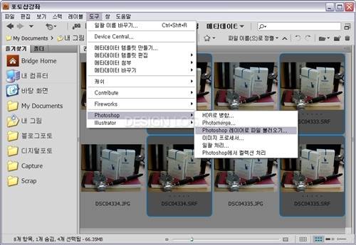 다음은 어도비 브릿지 CS4 메뉴 > 도구 > 포토샵(Photoshop)에서 포토샵 레이어로 파일 불러오기를 클릭합니다.