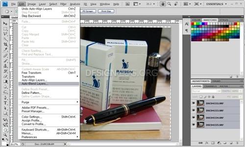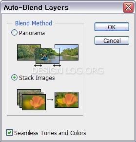 이제 자동 정렬된 레이어를 자동 혼합 레이어(Auto-Blend Layers)로 노출이나 색상을 최적의 상태로 바로 잡아주기 Edit > Auto-Blend Layers 명령을 클릭합니다.