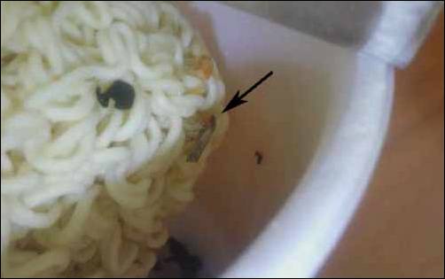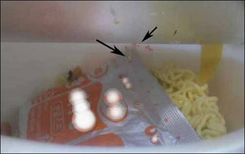 컵라면 속에서 나온 나방과 나방알을 놓고 식품회사의 책임론이 불거지고 있다.지난 10일 저녁 대구에 사는 김아무개(38, 서구 내당동)씨는 한 지하철역 내 매점에서 모 회사 컵라면을 하나 구입했다. 구입 직후 다니는 회사 사무실로 와서 컵라면 뚜껑을 개봉한 김씨는 경악을 금치 못했다. 컵라면 용기 속에서 모기만한 크기의 흰색 벌레 한 마리가 살아서 움직이고 있었기 때문이다.