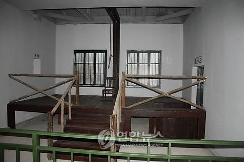 (선양=연합뉴스) 박종국 특파원 = 하얼빈 의거 100주년을 맞아 뤼순감옥 내에 복원된 안중근 의사 교수형장. 당시 언론 보도 등을 토대로 뤼순감옥의 3개 교수형장 가운데 이 곳에서 안 의사의 사형이 집행된 것으로 결론 내려져 당시 모습대로 복원됐다. 2009.8.13.