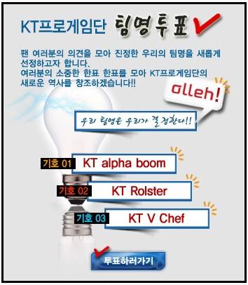 KT 프로게임단이 17일부터 새 팀명을 정하는 팬투표를 시행한다. KT는 오는 31일까지 이번 투표를 진행하며 KT 프로게임단 홈페이지 투표를 통해 집계하고 있다.