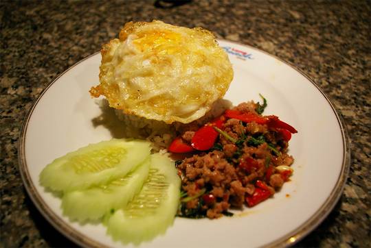 주로 다진 돼지고기와 채소에 바질과 매운 고추를 넣어 매콤하게 볶는데, 돼지고기 대신 닭고기나 소고기를 사용하기도 한다. 이 음식을 먹을 때 태국 쥐똥고추를 썰어 넣은 생선소스를 뿌려 먹으면 더욱 맛있다.