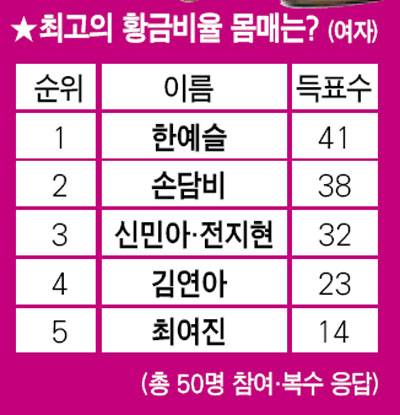 설문에 응한 대다수 전문가들은 한예슬의 작은 얼굴과 볼륨감 있는 몸매를 꼽았다. 허리와 힙의 황금비율이라 할 수 있는 0.72:1에 가깝다고 입을 모았다. 슈퍼모델 출신인 한예슬은 168cm로 그리 크지 않으나 볼륨감 있는 몸매가 이를 완벽하게 커버하고 있다.