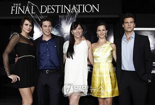 (좌로 부터) 출연배우들인 샨텔 반산텐, 보비 캄포, 크리스타 앨런, 헤일리 웹, 그리고 닉 자노가 2009년 8월 27일 로스 앤젤레스에서 새 영화 '최종 행선지'의 시사회에서 함께 포즈를 취하고 있다(AP=연합뉴스).(hcs). (paulohan@naver.com).