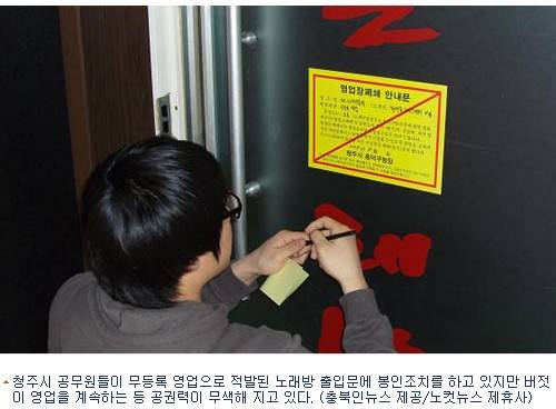 청주시의 경우 경찰의 적발사실이 통보되면 자진폐쇄를 종용하거나 출입문을 봉인하고 있지만 이 또한 아무런 효과가 나타나지 않는다.