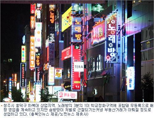 노래방 업계에 따르면 하복대 상업지역 내에서 16~18개 노래방이 영업하고 있는데 이중 5~6개가 학교정화구역 금지 조항 때문에 등록이 되지 않는 무등록 업소라는 것이다.