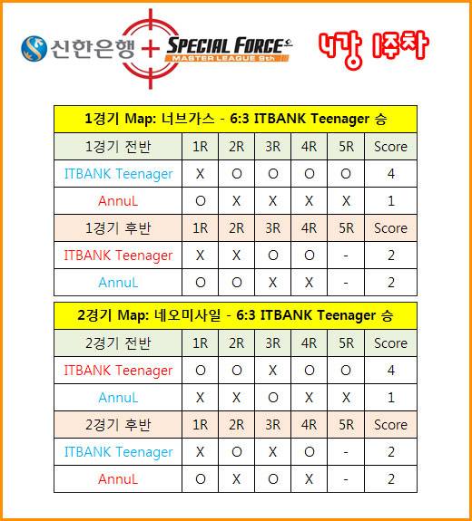1세트 전반 AnnuL은 1라운드를 따낸 이후 김준우가 5대 1의 상황에서 4킬에 성공하며 초반 분위기를 가져왔다. 하지만, 김지훈의 강력한 한 방과 이창하-최원석 콤비의 맹활약에 힘입어 ITBANK Teenager가 6대 3의 스코어로 1세트를 승리로 가져갔다.