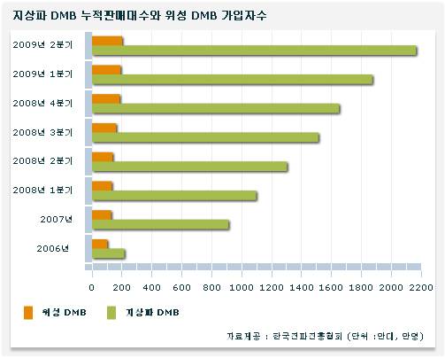 서비스 요금이 무료인 만큼 DMB 시장을 주도하는 건 지상파DMB다. 최근 지상파DMB 단말기 보급대수는 2,000만대를 돌파한 것으로 나타났다. 한국전파진흥협회가 올해 4월부터 6월까지 3개월 동안 DMB 단말기 판매 동향을 분석한 결과 6월말을 기준으로 지상파DMB 단말기의 누적 보급대수는 2,155만대다.