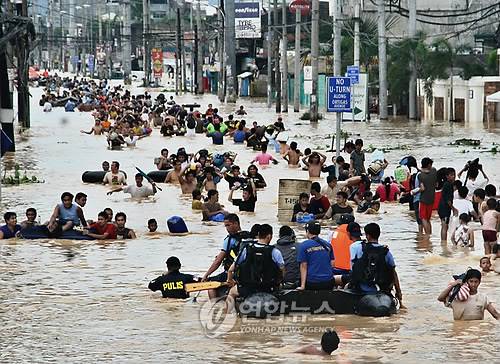 필리핀 마닐라 동쪽 카인타에서 27일 주민들이 가슴까지 차오른 물을 헤쳐가고 있다. 26일 필리핀을 강타한 태풍 켓사나는 27일 오후 현재 75명이 숨지거나 실종되는 등 40년만에 최악의 피해를 낳았다. 이재민도 30만명에 육박하고 있다. 정부는 25개 피해지역에 재난사태를 선포했다. (AP=연합뉴스)