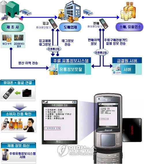 (서울=연합뉴스) 국세청은 주류 불법유통 근절을 위해 RFID(무선주파수인식) 기술을 활용한 '주류유통정보시스템'을 구축하고 작년 1차 시범사업에 이어 금년 10월1일부터 실시지역 및 유통물량을 확대하여 2차 시범실시에 들어갈 계획이다. 사진은 무선인식기술 활용 주류유통정보시스템 개념도. 2009.9.30 < < 국세청 제공 > >