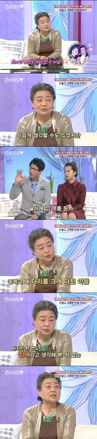 강부자는 "장애라고 생각한 적이 없다"면서 "아들은 학교에서 단체기합을 받다가 다쳤지만 항의 한 번 한 적 없다"고 담담하게 말했다.