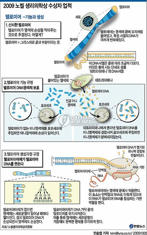 인간 생체타이머 수수께끼 푼 공로 인정새로운 항암제 개발 실마리 제공(서울=연합뉴스) 김길원 기자 = 올해 노벨생리의학상 수상의 영예는 세포 분열의 수수께끼를 풀 수 있는 `텔로미어'와 `텔로머라아제'를 발견한 연구자들에게 돌아갔다.
