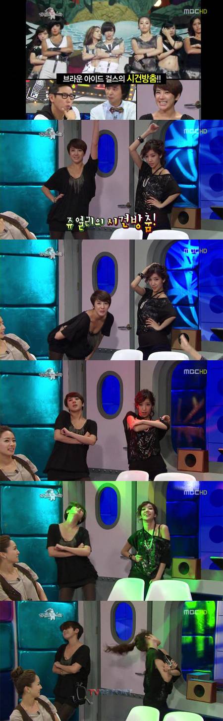결국 MC들에게 떠밀려 하주연과 함께 즉석에서 '시건방춤'을 선보인 서인영. 안무를 제대로 모른다며 자신없어 했으나 도도한 눈빛과 특유의 표정으로 싱크율 100%를 자랑했다.