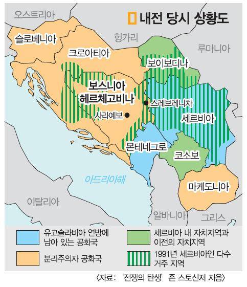 세르비아민주당 당수였던 라도반 카라지치는 사라예보를 수도로 스르프스카공화국을 세운다. 대통령으로 취임한 그는 유고연방의 지원을 받고 내전을 주도하게 된다. 이후 '동유럽의 꽃'이었던 사라예보는 '죽음의 도시'가 됐다. 43개월간 봉쇄된 도시 안에서 민간인 1만여명이 테러에 죽어갔다. 보스니아 전역에서는 25만명이 숨지고 300만명이 난민으로 떠돌았다. 전쟁은 '나치의 대학살'에 비유될 만큼 참혹했다. 인종청소 정책의 일환으로 여성 2만명이 강간을 당했고 신체적·정신적 고문, 대량학살이 일상적으로 이뤄졌다. 특히 이슬람 교도들이 집단으로 거주하던 스레브레니차에서는 1995년 8000여명의 남자와 소년들이 집단으로 학살됐다.