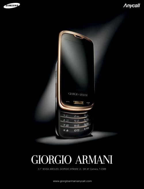 조르지오 아르마니폰은 풀터치에 슬라이드 키패드를 적용한 하이브리드 타입의 제품으로 아몰레드(AMOLED) 디스플레이, 사파이어 글래스, 조르지오 아르마니 UI 등을 탑재해 명품폰의 가치를 더했다.
