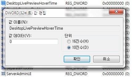 3. DesktopLivePreviewHoverTime의 값을 500에서 0으로 바꿉니다. 참고로 기본값인 500은 0.5초를 의미합니다. 값 데이터는 16진수가 아닌 10진수에 놓고 입력해 주세요.