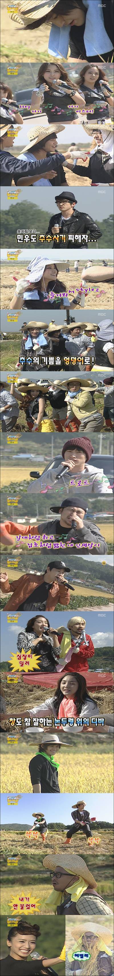 카라는 논두렁에서 히트곡 '미스터'의 깜짝 무대를 선보이며 주위를 열광케 했다. 이후 두 손을 걷어붙이며 낫을 들고 추수에 동참한 카라는 '무한도전' 멤버들의 사랑을 독차지했다. 급기야 추수하던 도중 모든 출연진들은 카라의 엉덩이춤을 단체로 추며 자칫 지루하기 쉬운 현장 분위기를 뜨겁게 달궜다.