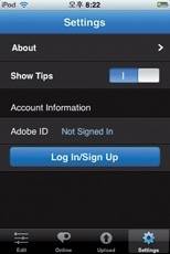 애플리케이션은 아이폰 혹은 아이팟 터치에 저장돼 있는 사진을 불러 와 이미지 처리하는 에딧(Edit)와 포토샵닷컴 라이브러리 접속이 가능한 온라인, 이미지 처리한 이미지를 포토샵닷컴으로 업로드 하는 메뉴, ID 관리를 위한 셋팅(Settings) 메뉴로 구성돼 있다.