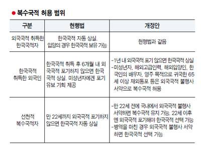 개정안은 또 한국인과 결혼한 배우자, 해외입양인, 영주귀국한 65세 이상 고령 동포, 한국 출생 후 20년 이상 거주자 및 2대가 한국에서 거주하는 자, 국익에 도움이 되는 해외 고급인력의 경우에도 서약을 하면 복수국적을 보유할 수 있게 했다.