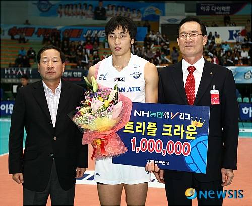 【서울=뉴시스】15일 인천 도원체육관에서 열린 프로배구 NH농협 09-10 V리그 대한항공-신협상무 인천경기에 앞서 지난번 경기에서 시즌1호 트리플크라운을 기록한 대한항공 김학민에게 시상을 하고 있다.