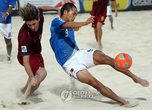 epa01939914 Bilro (L) of Portugal vies for the ball with Shusei Yamauchi of Japan at quarter final of FIFA Beach Soccer World Cup 2009 in Dubai, United Arab Emirates, 20 November 2009. EPA/ALI HAIDER < 뉴스의 새 시대, 연합뉴스 Live >< 연합뉴스폰 >< 포토 매거진 >< 저작권자(c)연합뉴스. 무단전재-재배포금지. >
