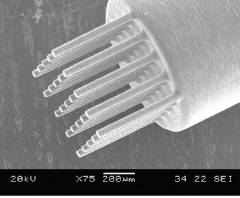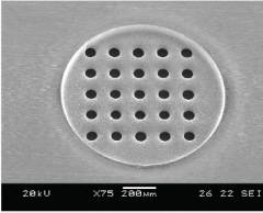 위의 사진의 왼쪽은 50㎛의 hole을 일정한 간격 50㎛으로 25개를 전기화학 가공한 예이다. 오른쪽 사진은 25개의 홀(Hole)을 만들기 위한 일종의 드릴(전기화학 가공 드릴)이 되겠다.