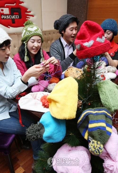 (서울=연합뉴스) 진성철 기자 = 9일 서울 파스쿠찌 광화문점에서 손님들이 신생아를 위한 털모자를 뜨개질하며 즐거워하고 있다. 파스쿠찌에서는 오는 25일까지 크리스마스케이크 구매 고객에게 세이브더칠드런의 신생아를 위한 모자뜨기 꾸러미를 선물한다. 2009.12.9