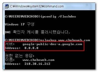 제대로 적용됐는지 확인하려면 명령 프롬프트에서 ipconfig /flushdns 입력 후 nslookup으로 아무 웹사이트를 찾아봐서 구글의 도메인 서버 정보가 나오는지를 체크하면 됩니다.