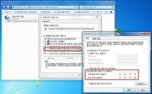 기본 DNS 서버에 8.8.8.8, 보조 DNS 서버에 8.8.4.4를 각각 입력해 주면 됩니다.