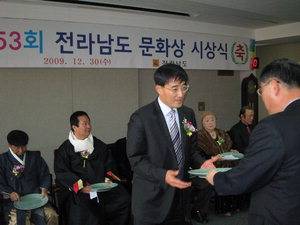 제53회 전라남도 문화상은 최고의 권위와 업적을 인정받고 있는 전문가로 구성된 전문심사위원이 평가하여 문학 분야 1명, 예술 분야 7명, 학술분야 1명을 각각 선정, 시상했다. 순천/나영석기자 ysn@kyunghyang.com