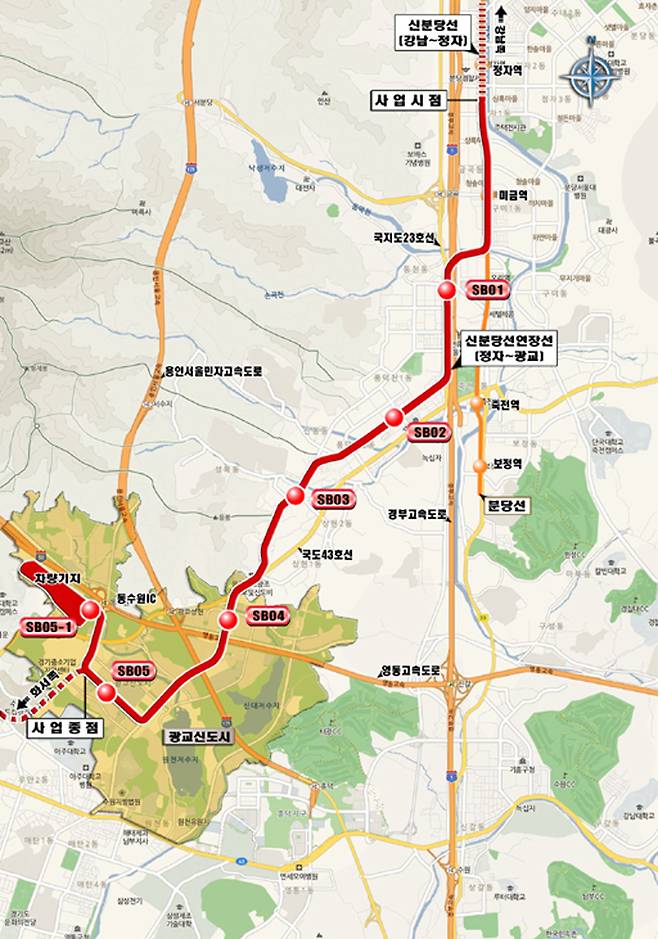 신분당선 연장(정자~광교) 전철은 분당선이 통과하는 경기도 성남시 정자역과 수원시 광교신도시를 연결하는 민간전철 사업으로 본선(강남~정자) 연장 11.2Km, 정거장 6개소, 차량기지 1개소를 신설하는 공사다. 연장 구간은 정자~동천~수지1, 2지구~신봉, 성복지구~상현지구~광교신도시 등을 지날 예정이다.