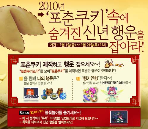 이번에 진행되는 '포춘쿠키 속 숨겨진 행운' 이벤트는 이벤트 기간 동안 아이템 제조나 사냥, 낚시 등을 통해 포춘 쿠키조각을 획득, 포춘쿠키를 제작하고 완성된 포춘쿠키를 열어 행운을 점치거나 포춘쿠키 조각 또는 팅키 인형을 받을 수 있다.