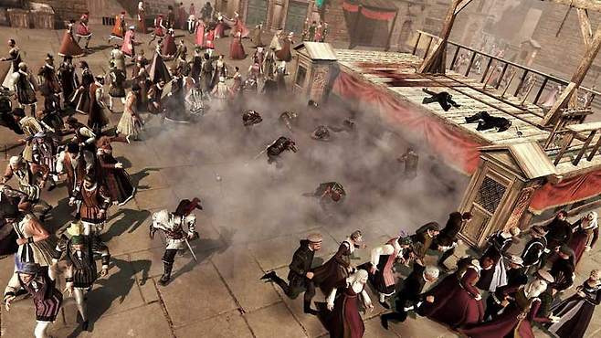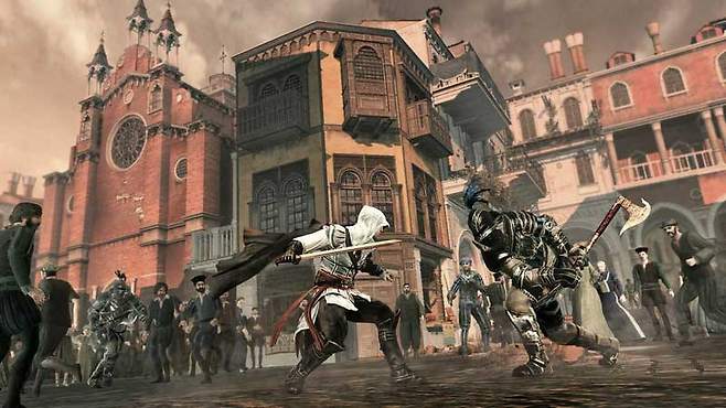 이번 '어쌔신크리드2'에서는 대규모 전투가 많다. 예전에는 '알테어'가 쫓기는 부분이 많았지만 이번에는 자신의 아군과 함께 싸우는 신이 대폭 증가했다. 하지만 이때 단순한 인공지능이 한몫 하면서 게임의 분위기를 망친다. 눈치챈 게이머들도 많겠지만 자신의 앞에 적을 제거한 이후에는 암살 형태로 주변의 적을 모두 죽일 수 있다.
